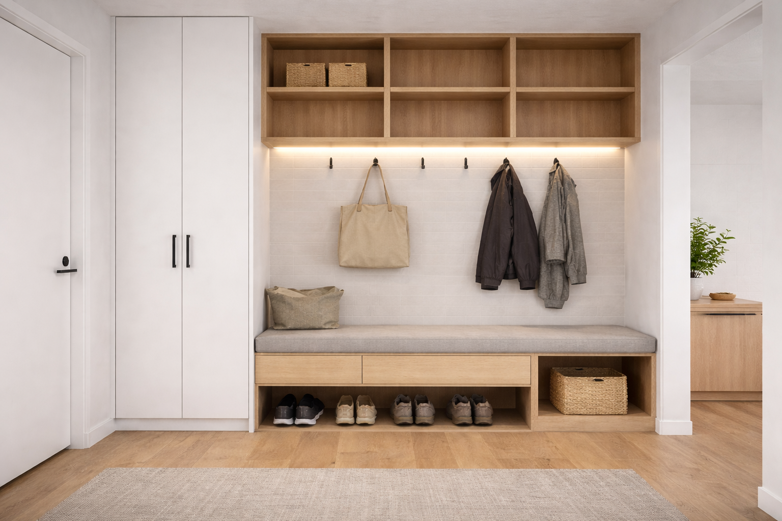 Mudrooms, pantries, bar units, laundries and utility storage designed to suit your home’s layout and lifestyle. From tall cabinets to shelving and bench seating, we tailor every detail for function and flow.